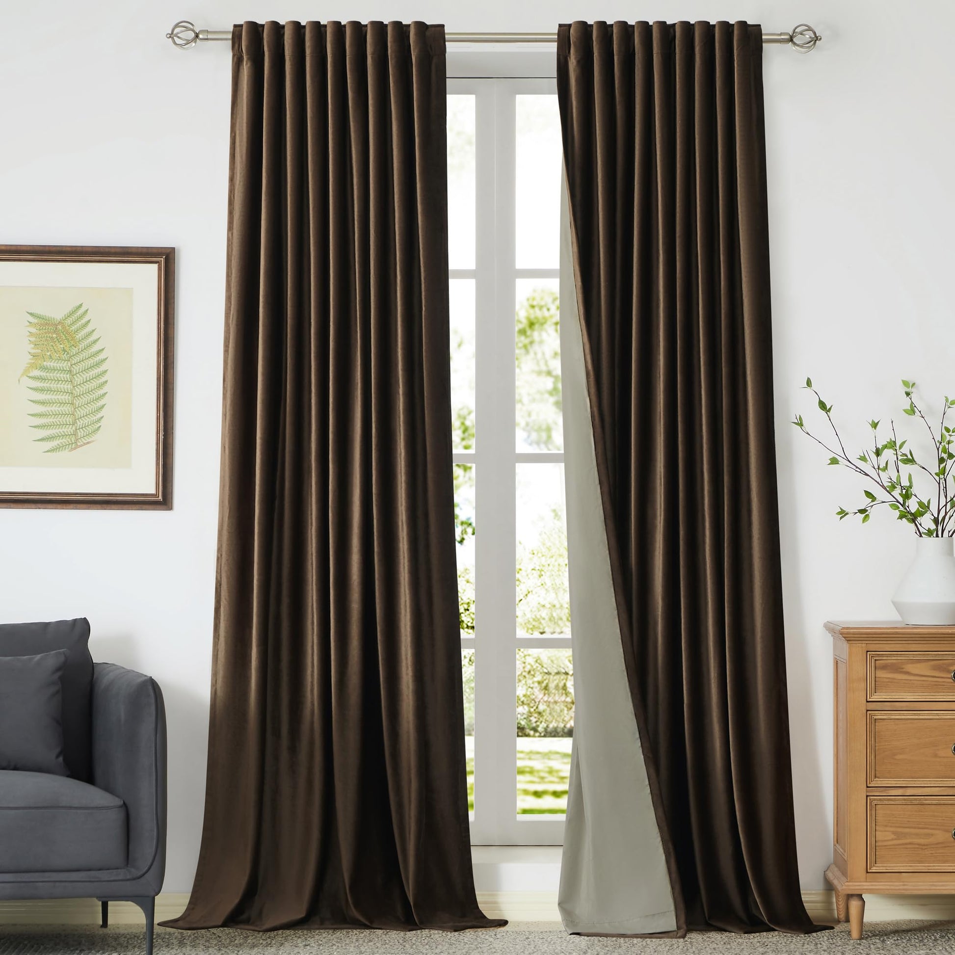 - PACKAGE:Includes 2 panels 100% blackout luxury plush velvet velour window curtains drapes W52 x L108 inch .Each panel has 2 hanging style--Rod Pocket & Back Tab.All hanging fit rod diameter up to 3 inch.(Rod pockets will form dense folds ,the back tab hanging style will creates neat folds in the curtains.)