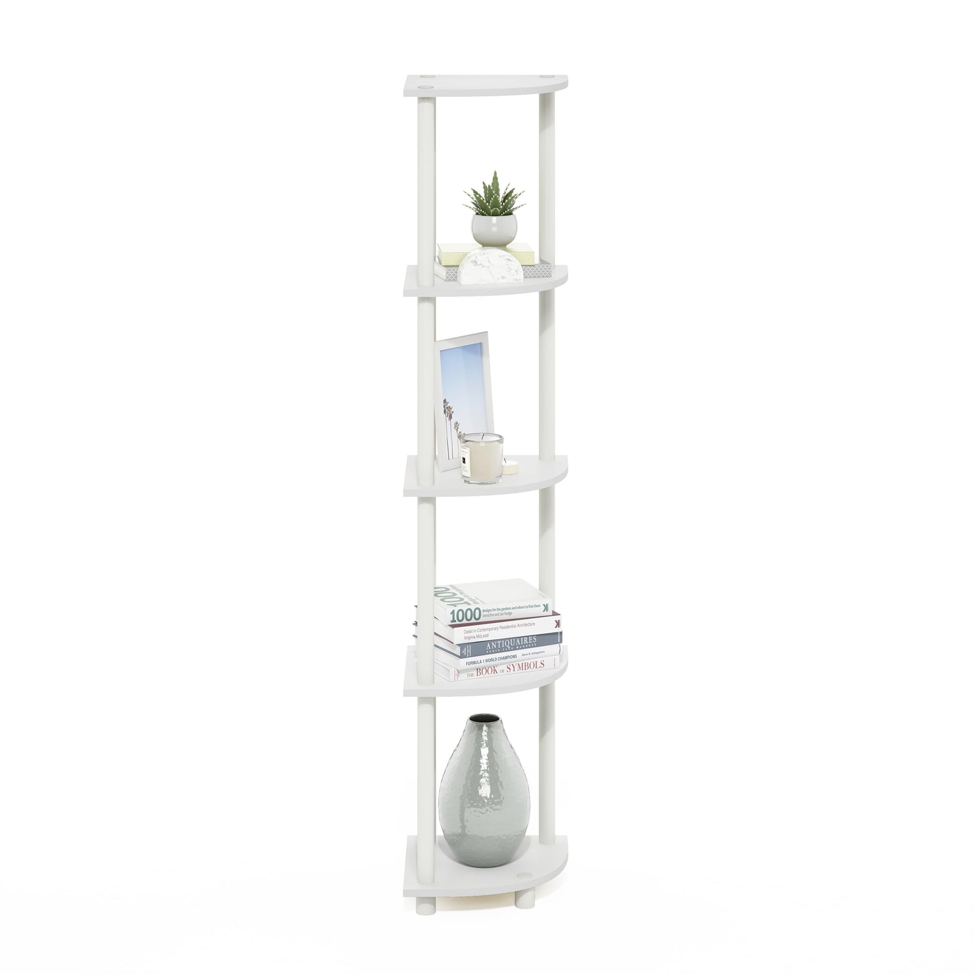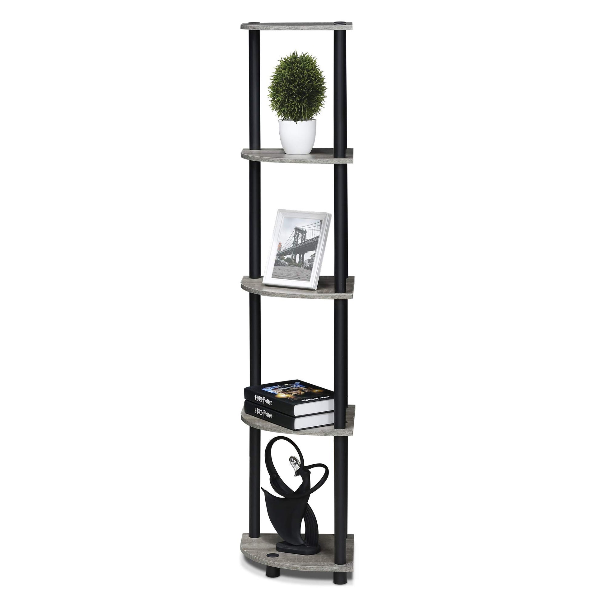 Furinno 5-tier tube display/storage corner rack is designed to meet the demand of low cost but durable and efficient furniture. It is proven to be the most popular rta furniture due to its functionality, price, and the no hassle assembly. The materials comply with e1 grade particle board for furniture. There is no foul smell of chemicals, durable and it is the most stable particleboard used to make rta furniture. Care instructions: wipe clean with clean damped cloth. Avoid using harsh chemicals. Please contact support@furinno for missing parts, damaged goods, or other questions. We are pleased to send you the replacement part free of charge. Pictures are for illustration purpose. All decor items are not included in this offer. Pictures are for illustration purpose. All decor items are not included in this offer.Holds up to 15 lbs per shelf.