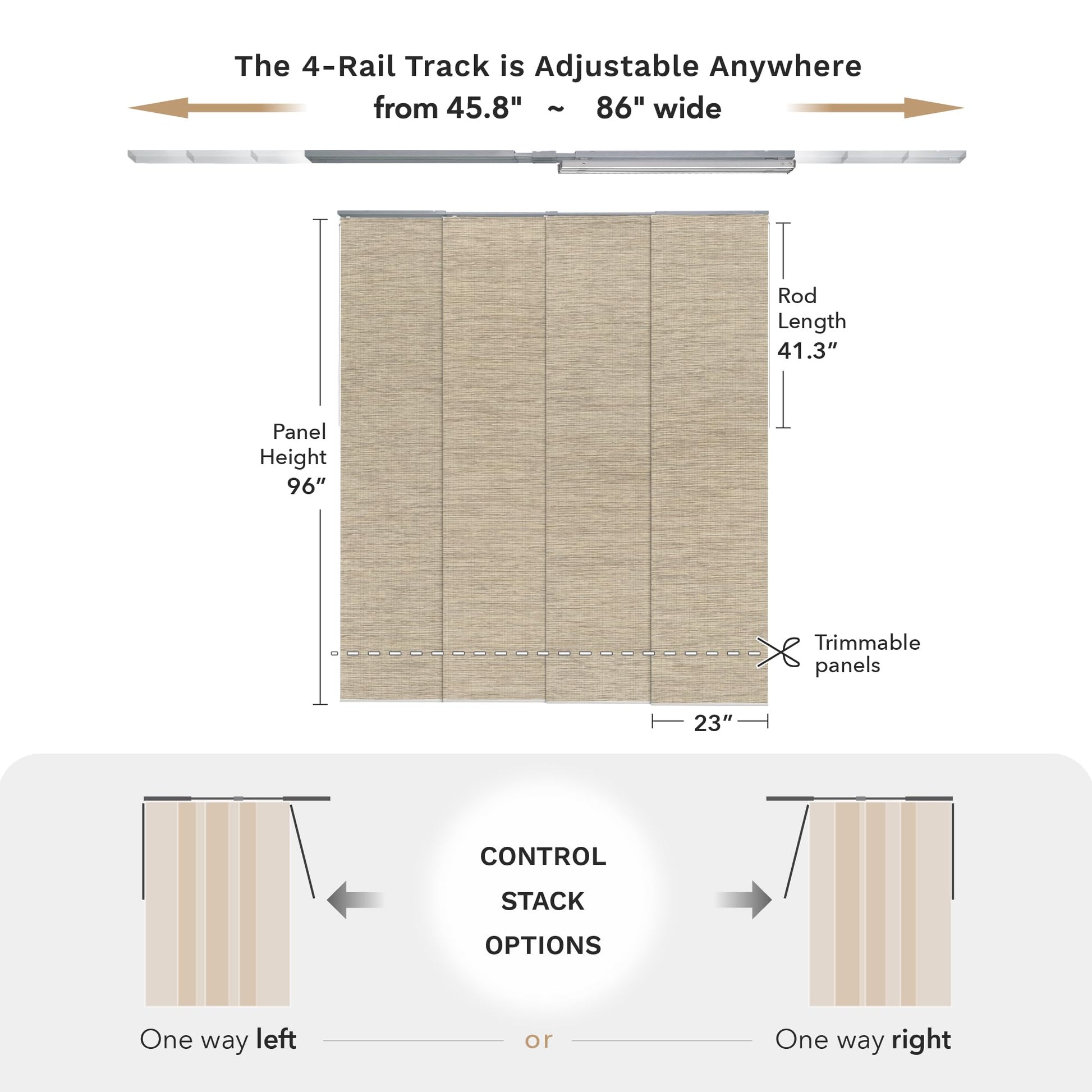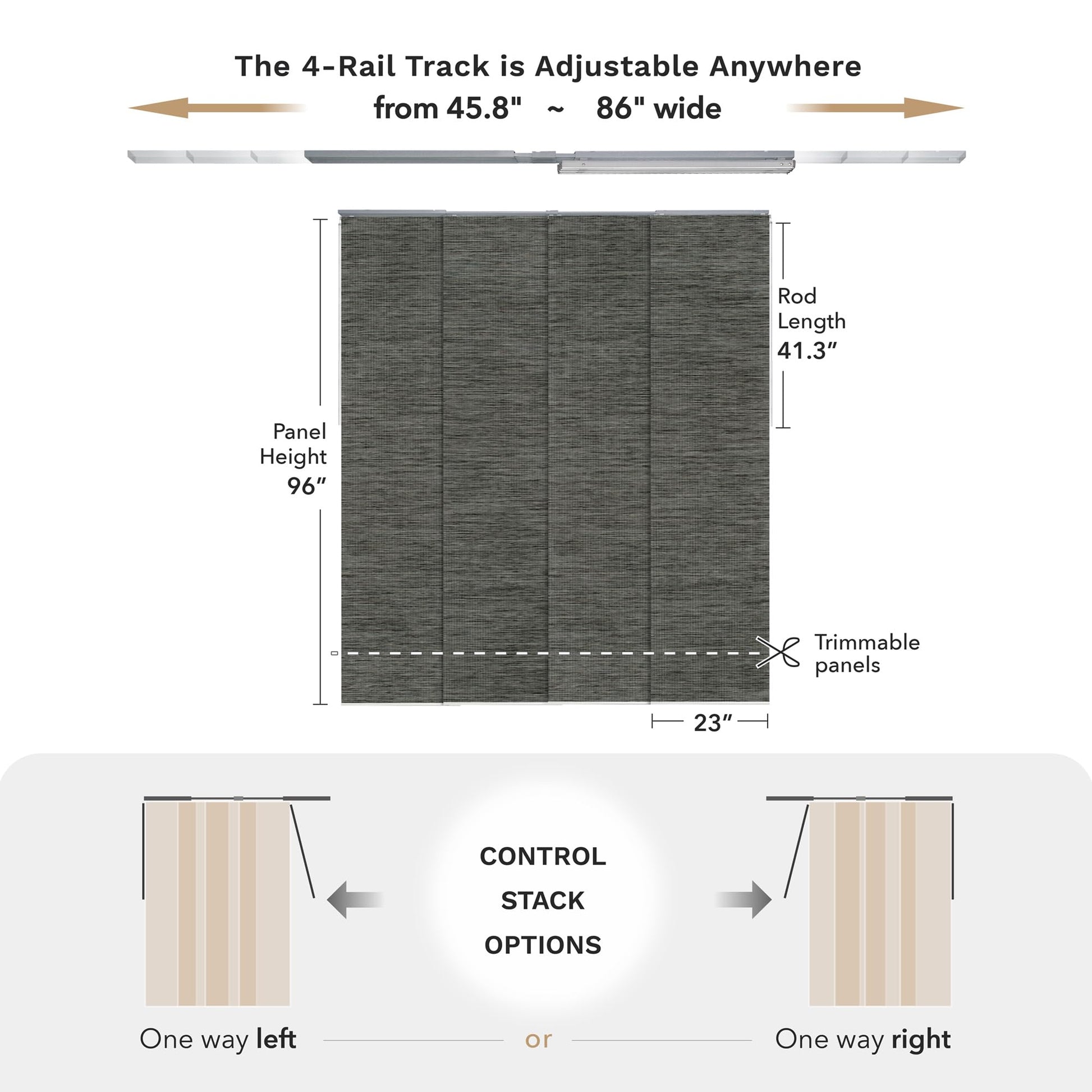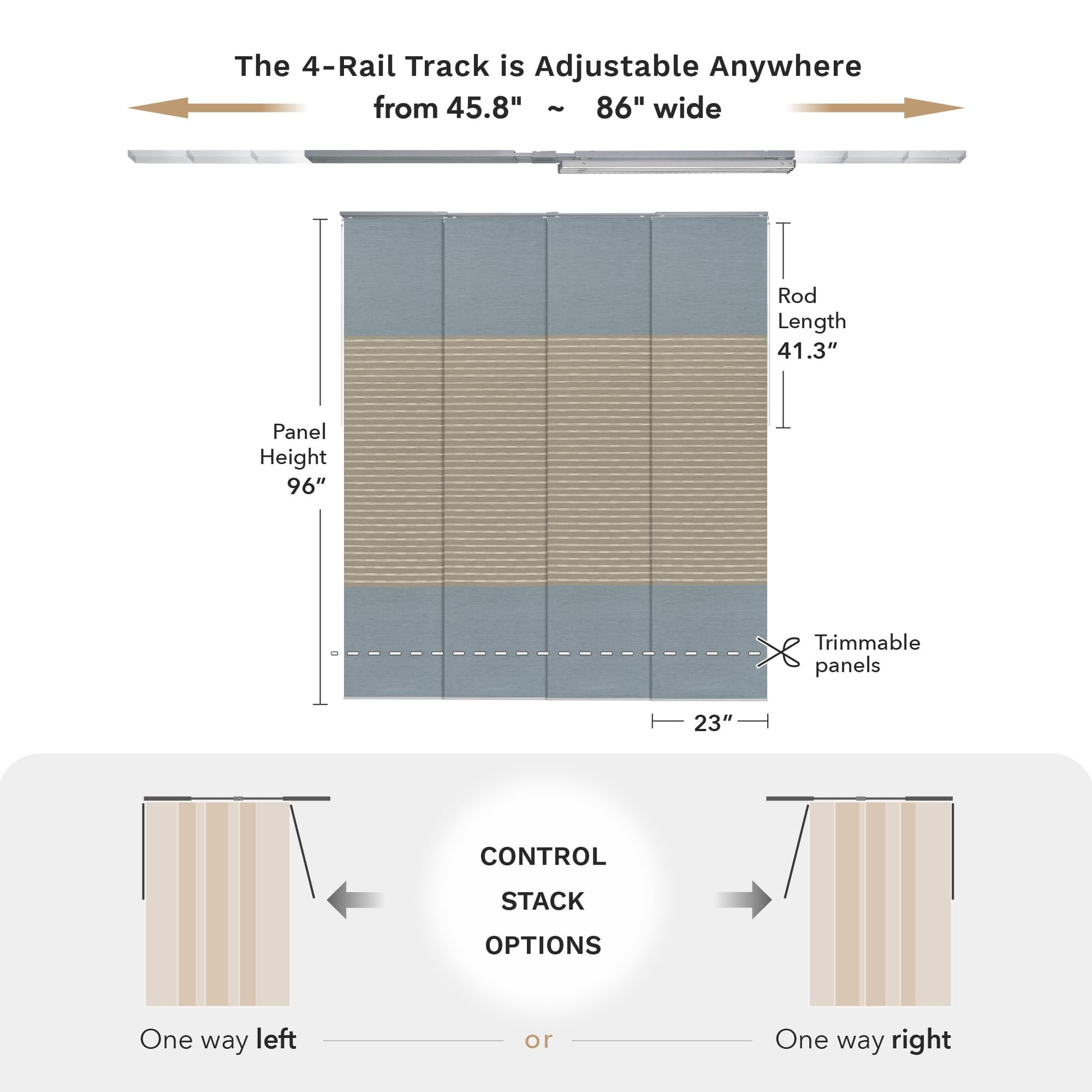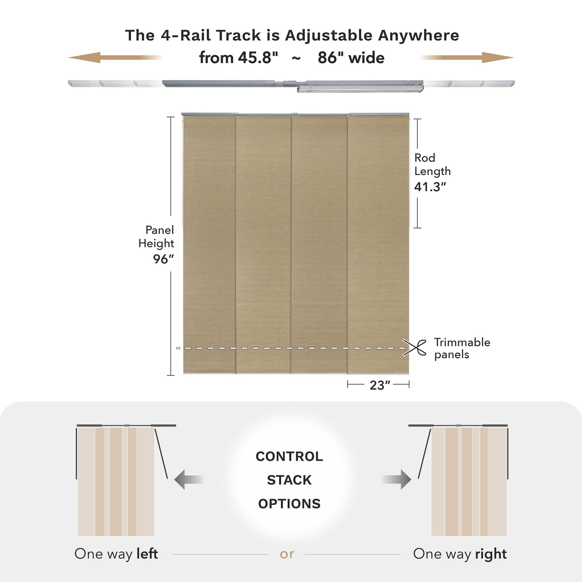 - 【STACK OPTIONS】This panel track can be mounted to the wall or ceiling and, moreover, there are 2 control stack options, you can easily slide with a solid metal wand (41.3" L) all the way to the right or left. Note that the panel overlap adjusts based on the track length. With the track extended to its maximum of 86", the overlap is 2". When the track is set to its minimum length of 45.8", the overlap increases to 15.4".