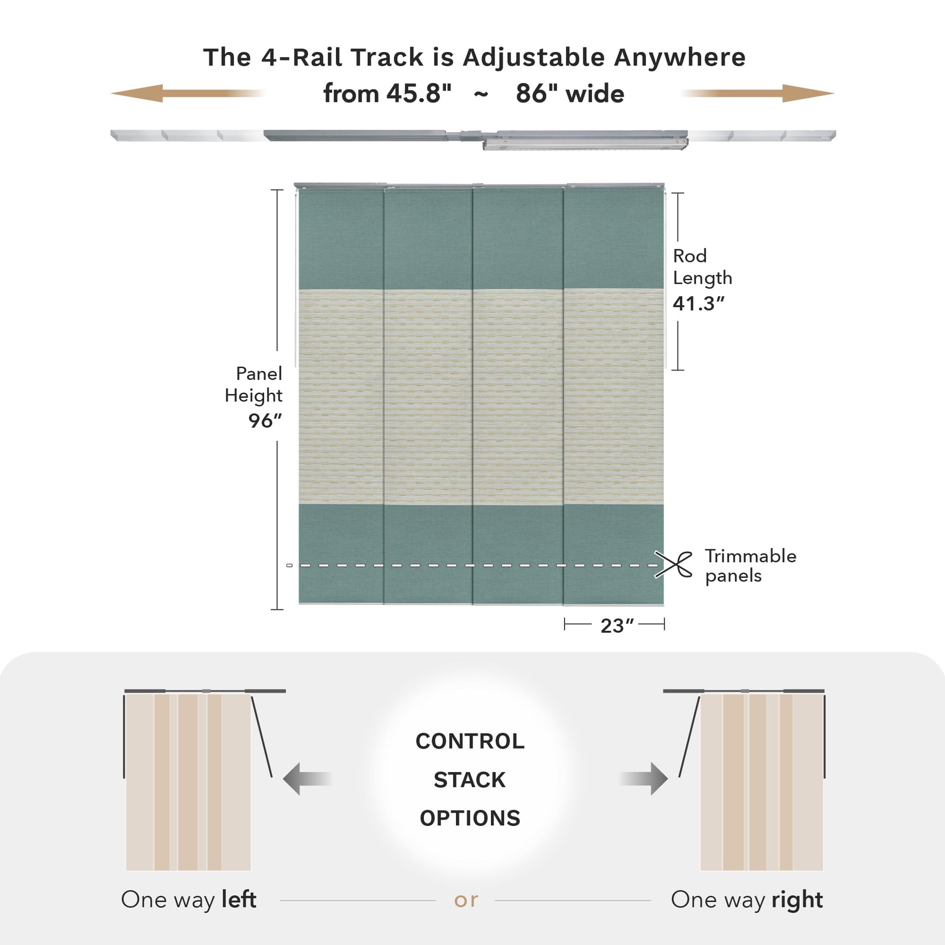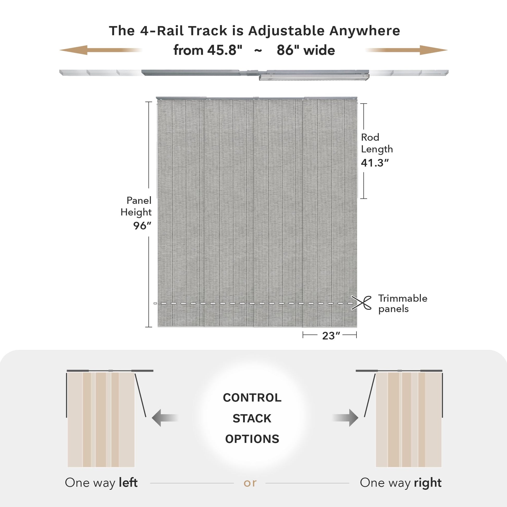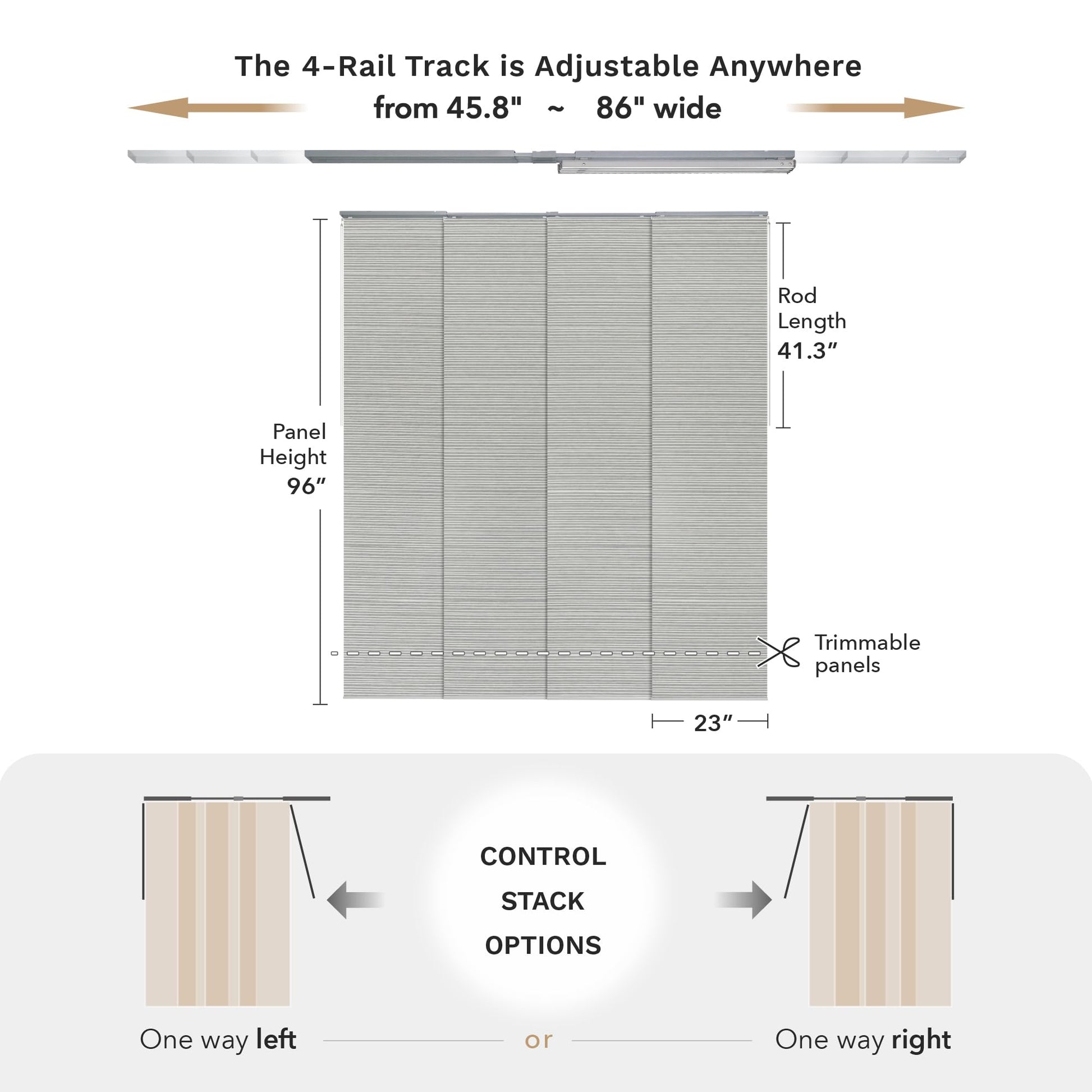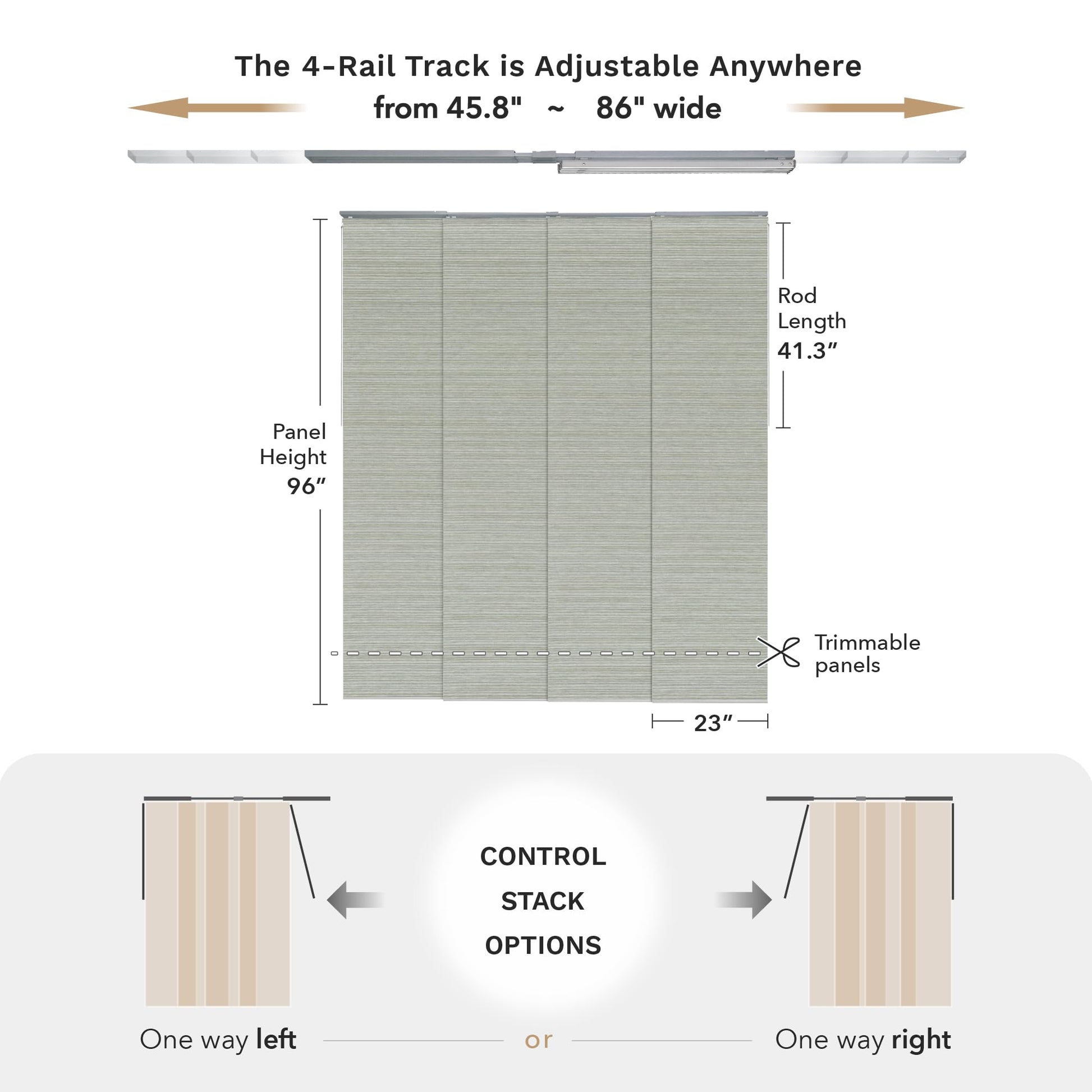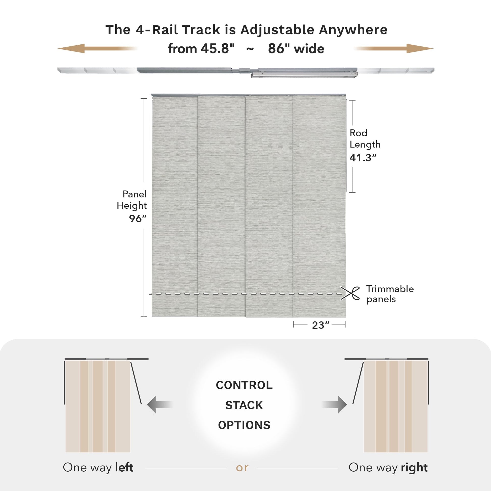- 【STACK OPTIONS】This panel track can be mounted to the wall or ceiling and, moreover, there are 2 control stack options, you can easily slide with a solid metal wand (41.3" L) all the way to the right or left. Note that the panel overlap adjusts based on the track length. With the track extended to its maximum of 86", the overlap is 2". When the track is set to its minimum length of 45.8", the overlap increases to 15.4".