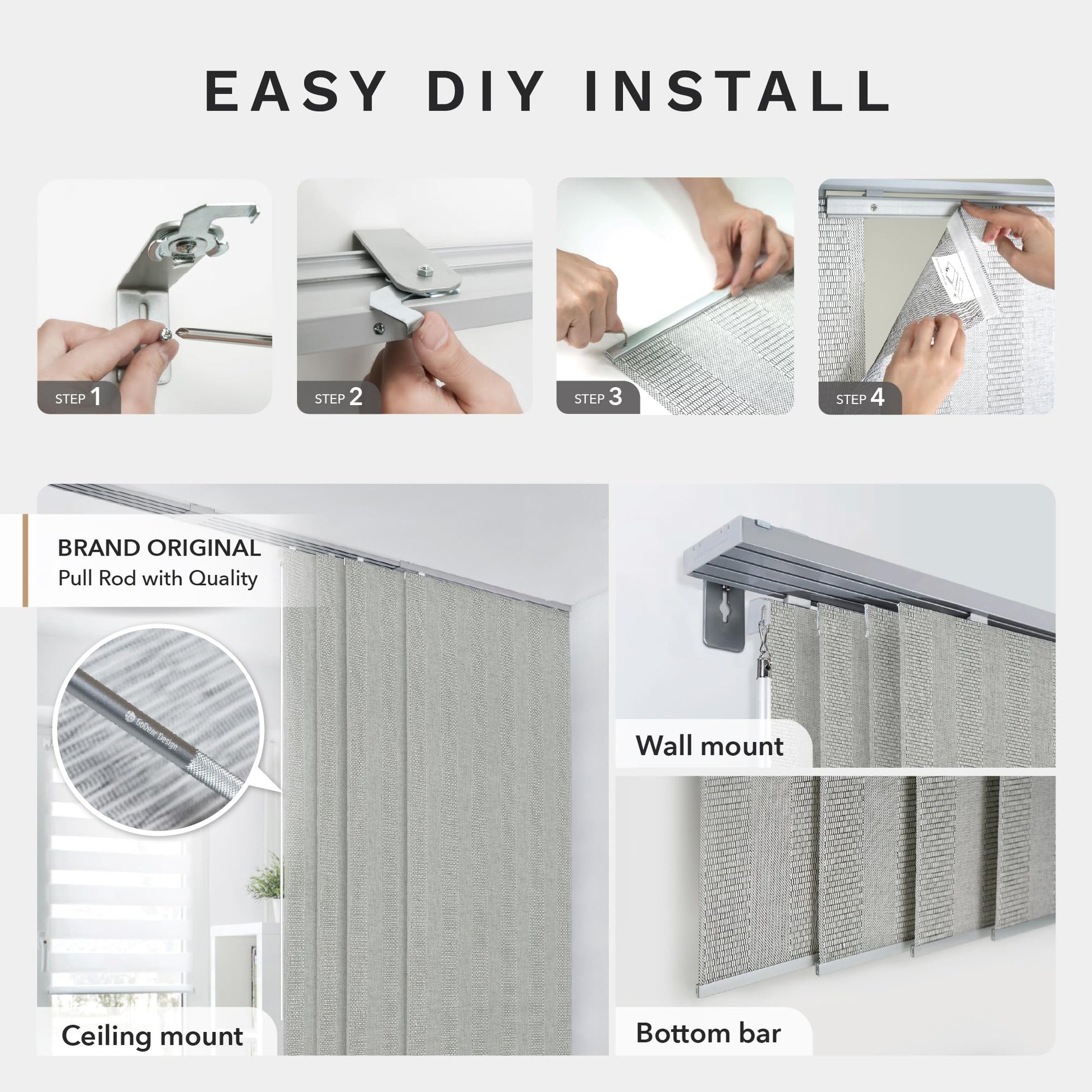 - 【INSTALLATION】GoDear panel track blinds are designed specifically for DIY and easy installation, you can choose different installation methods (wall or ceiling) according to your needs. (1) Inside Mount: Minimum 2.5-inch depth needed; (2) Outside Mount: Minimum 2.25-inches of bracket height required on the top.