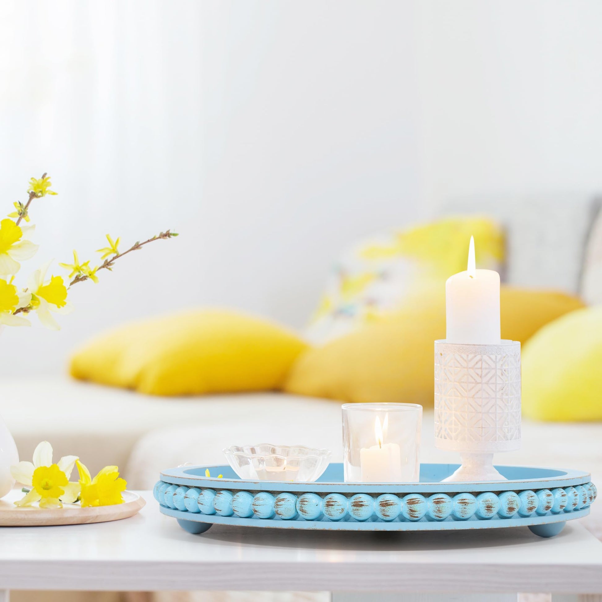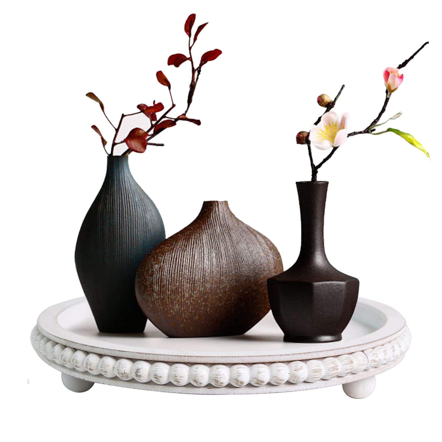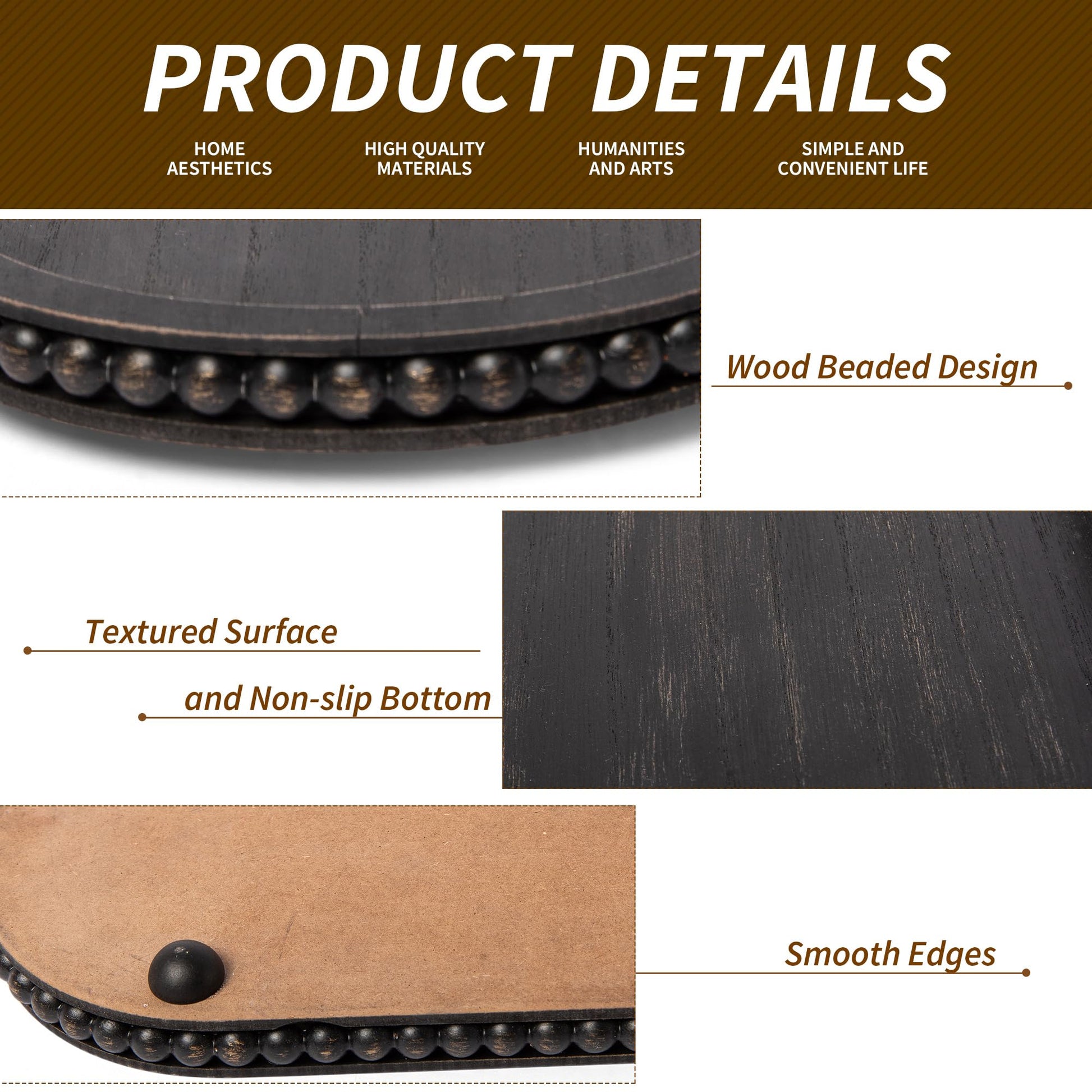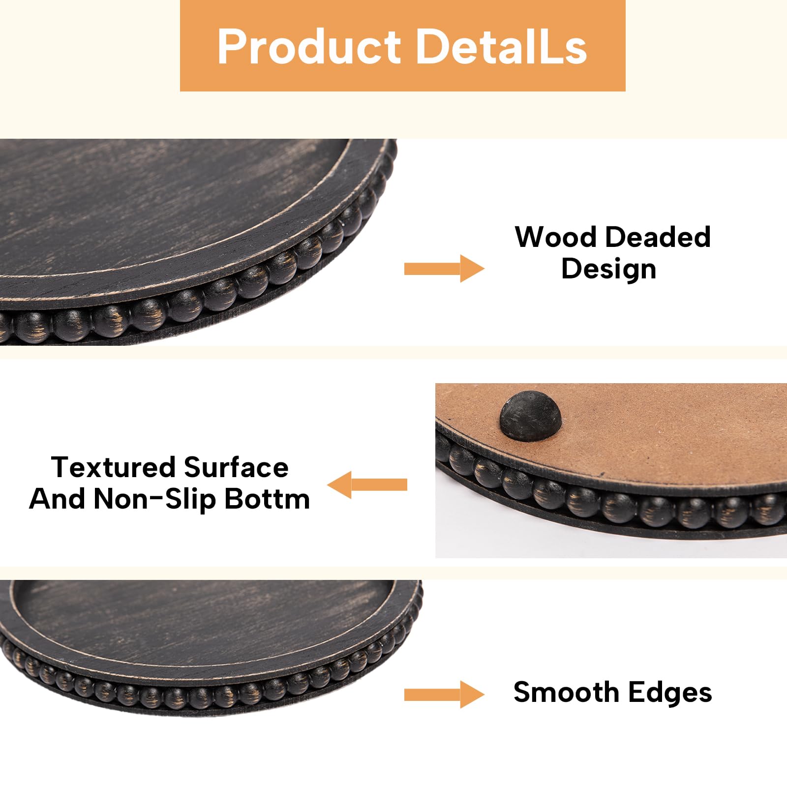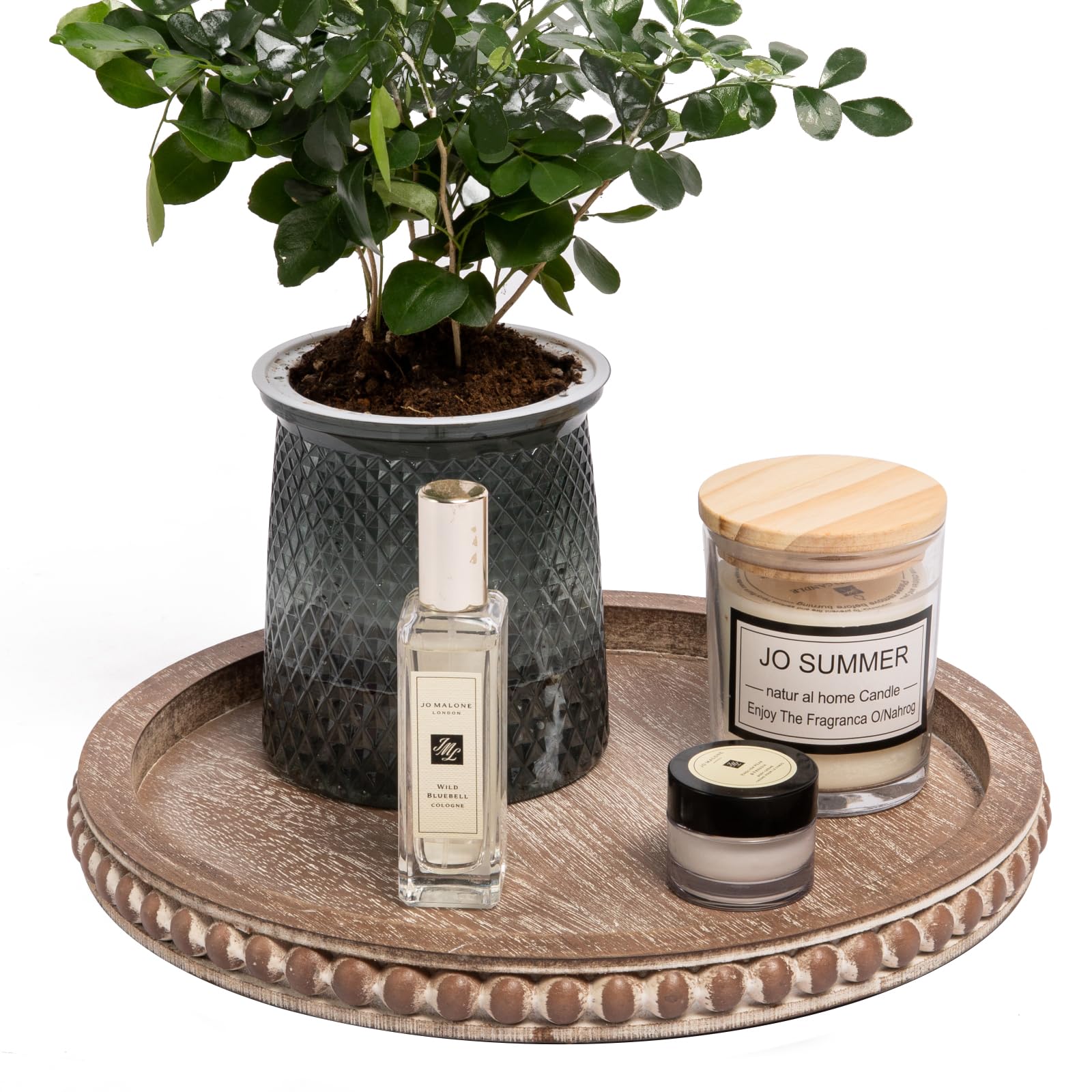 - 【Gorgeous Beaded Tray】:The round beaded tray features special distressed bead accents.Match these items as living room decor, coffee table decor or farmhouse kitchen decor. The decorative tray itself is surely an eye catching and a conversation piece as it comes with unique bead accents around tray.Place it as a centerpiece on your kitchen counter, dining table, entry way table and MORE!