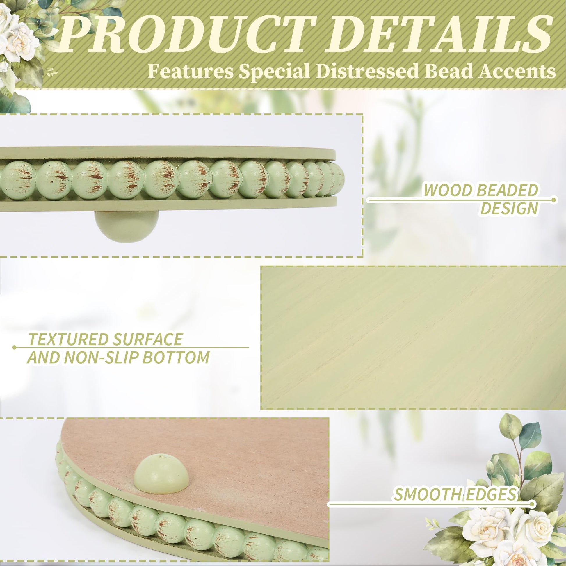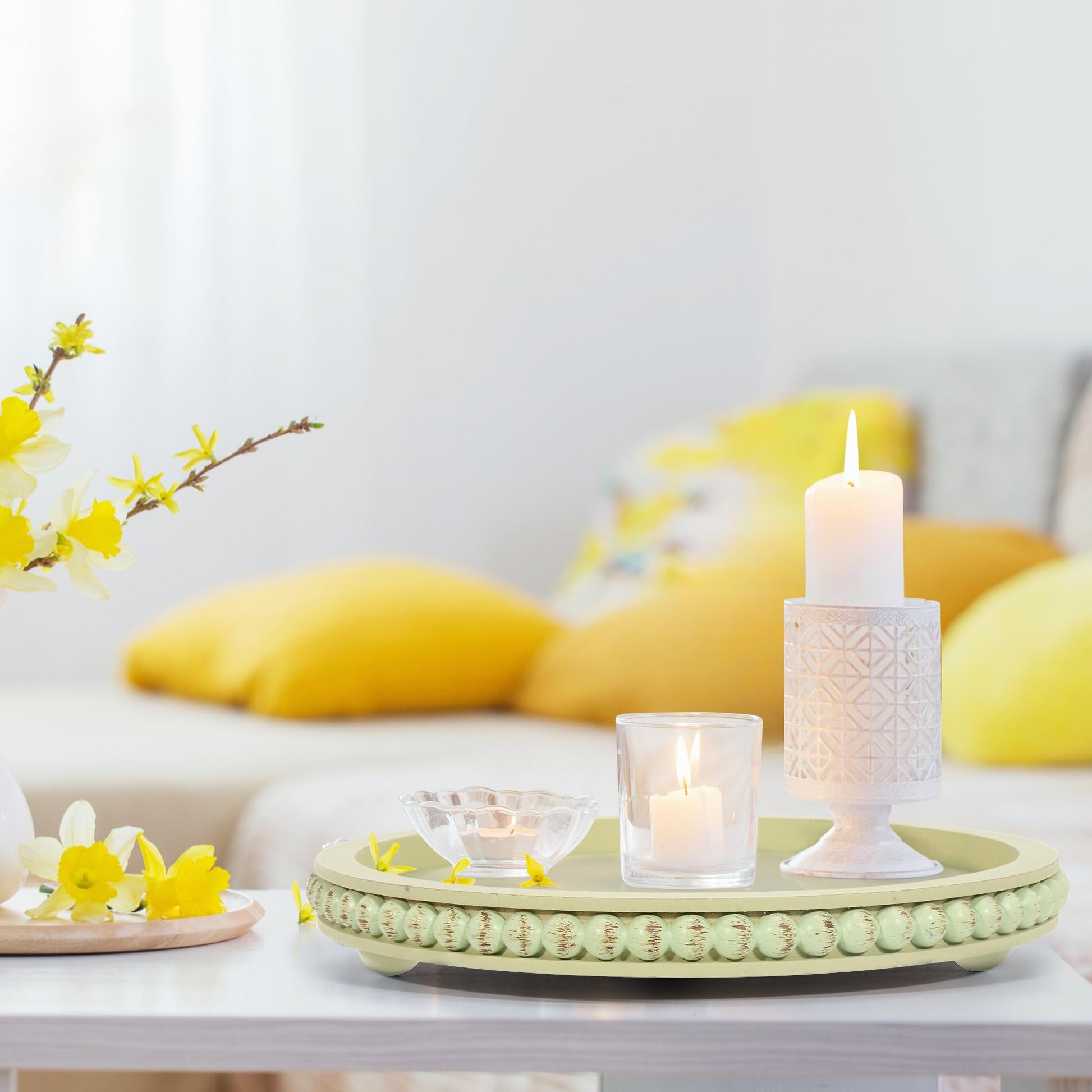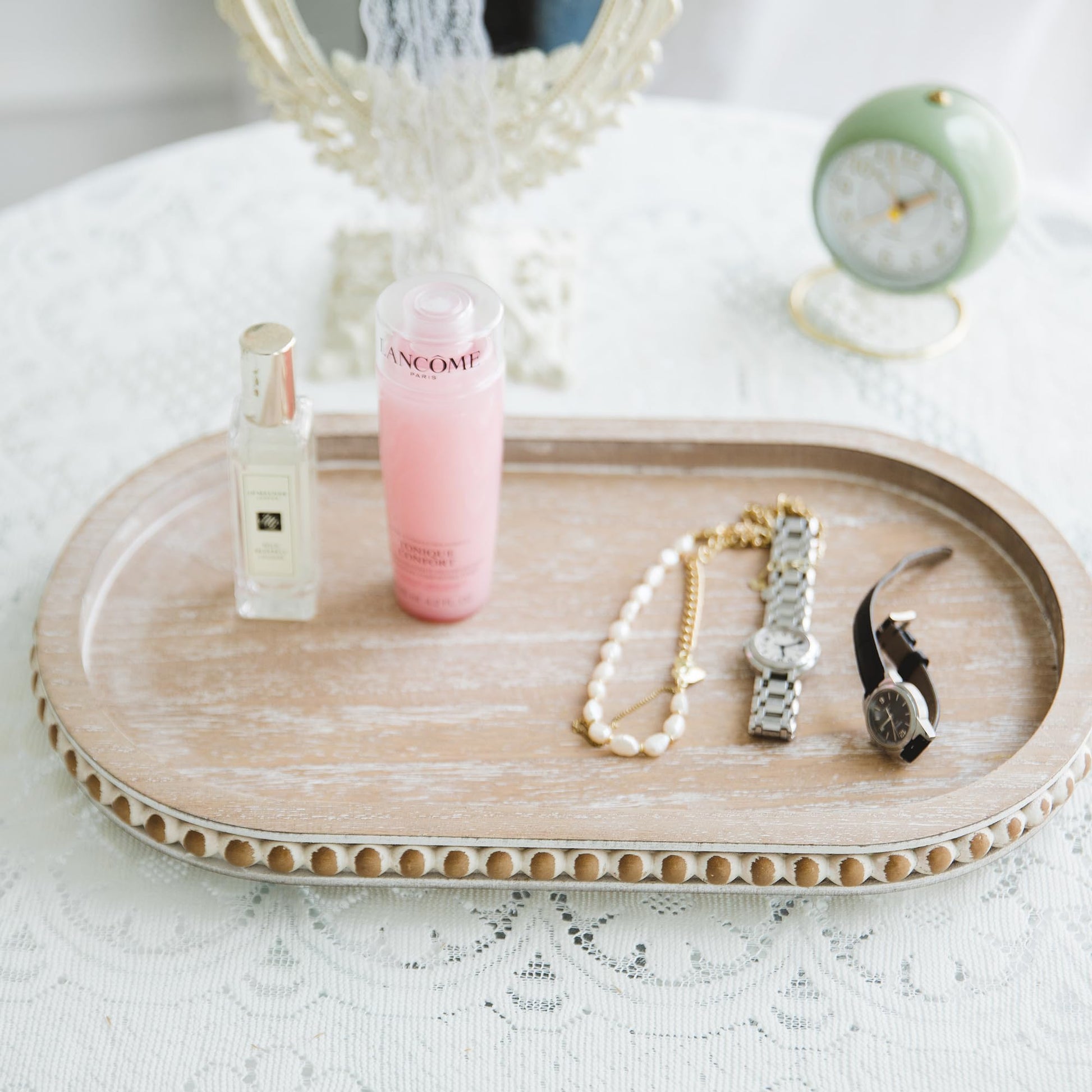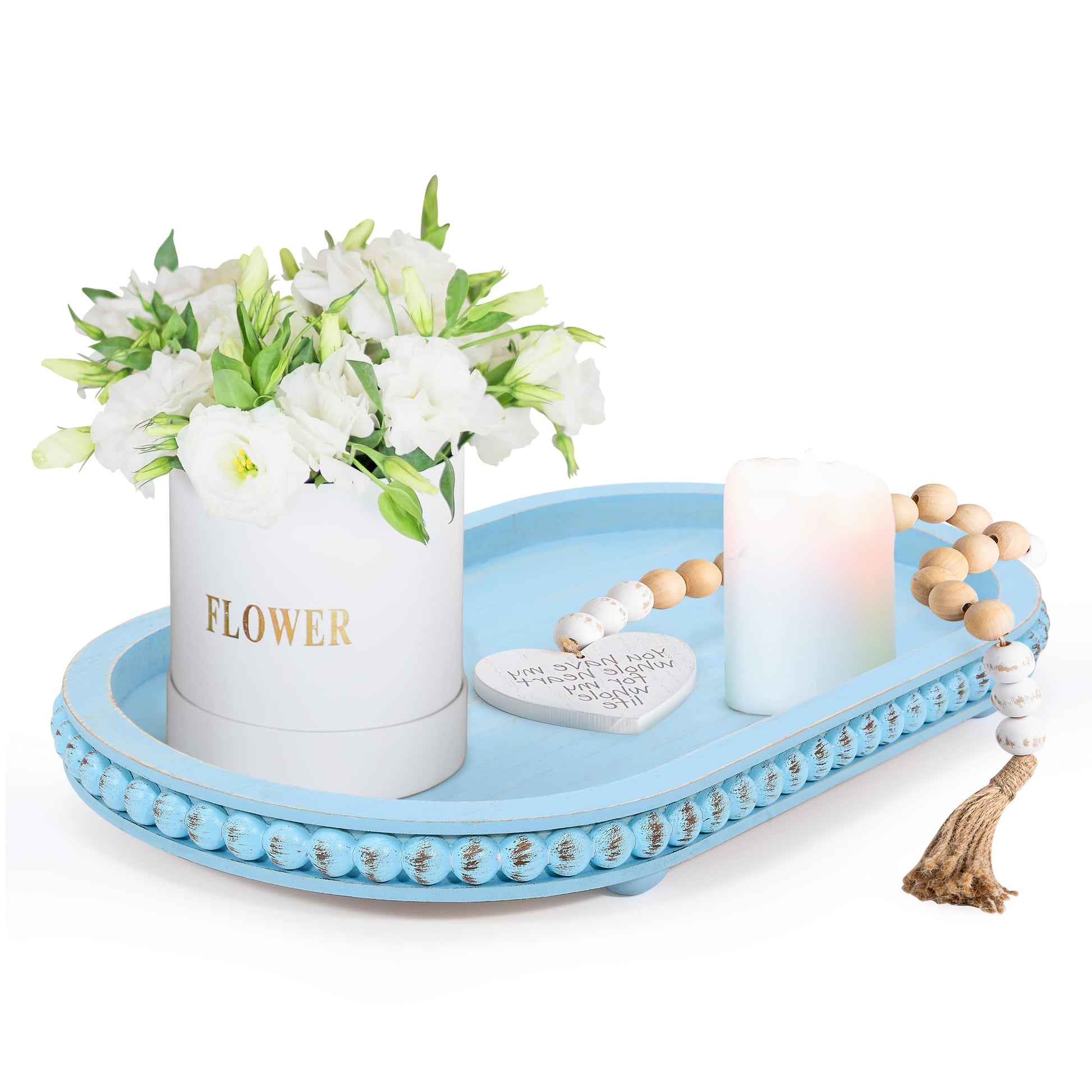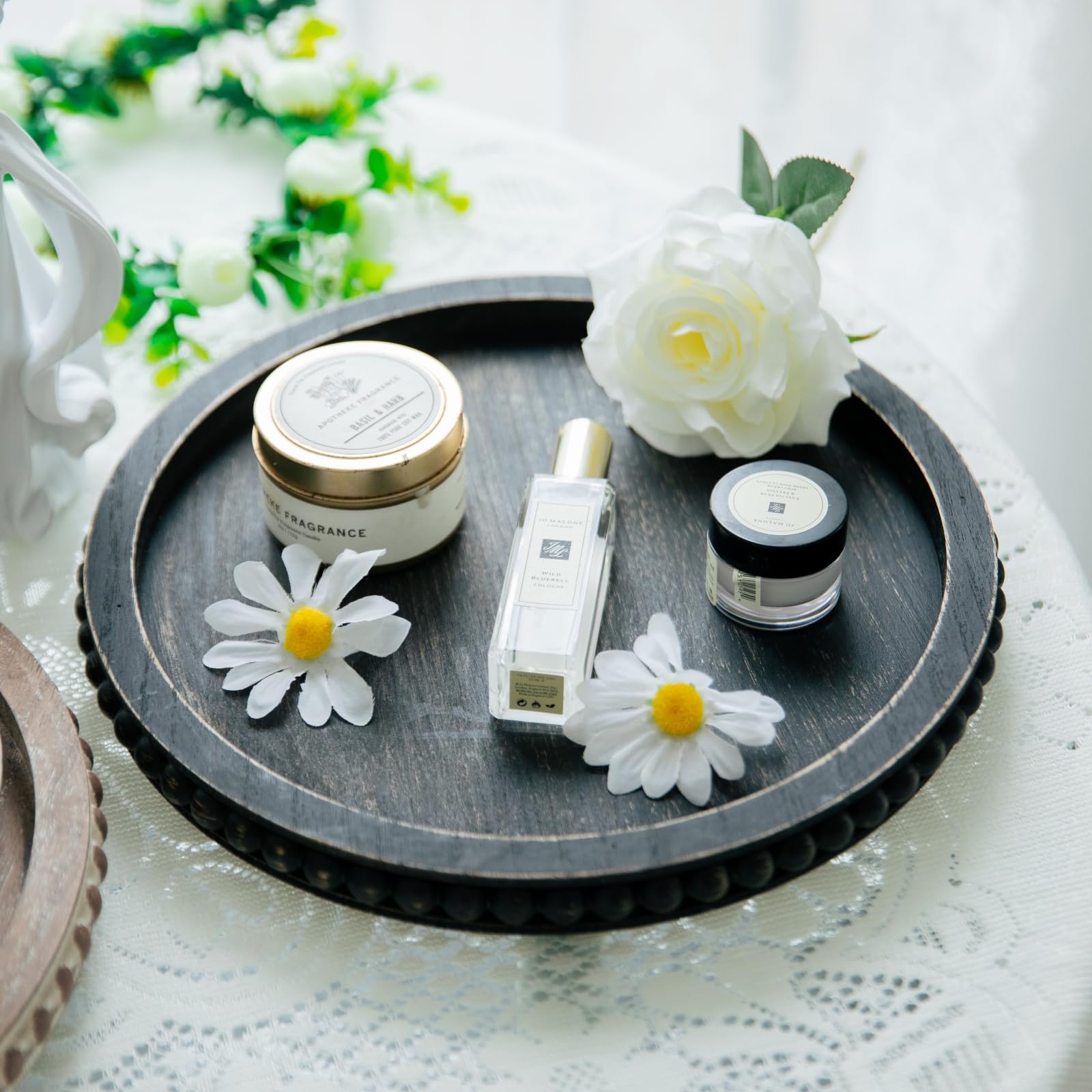 - 【Gorgeous Beaded Tray】:The round beaded tray features special distressed bead accents.Match these items as living room decor, coffee table decor or farmhouse kitchen decor. The decorative tray itself is surely an eye catching and a conversation piece as it comes with unique bead accents around tray.Place it as a centerpiece on your kitchen counter, dining table, entry way table and MORE!