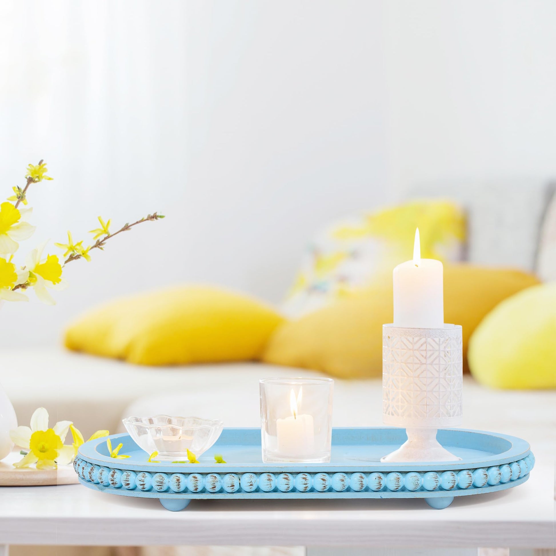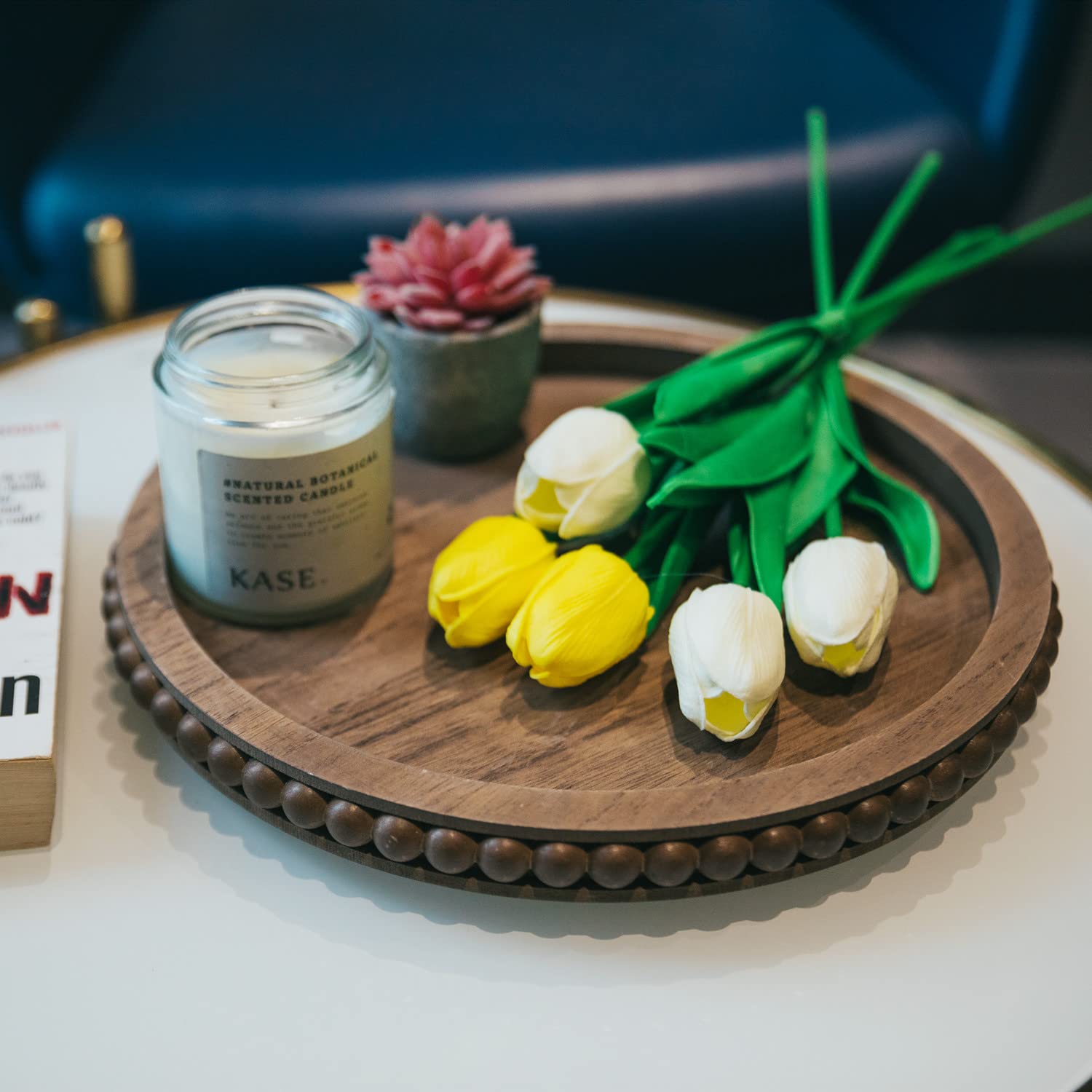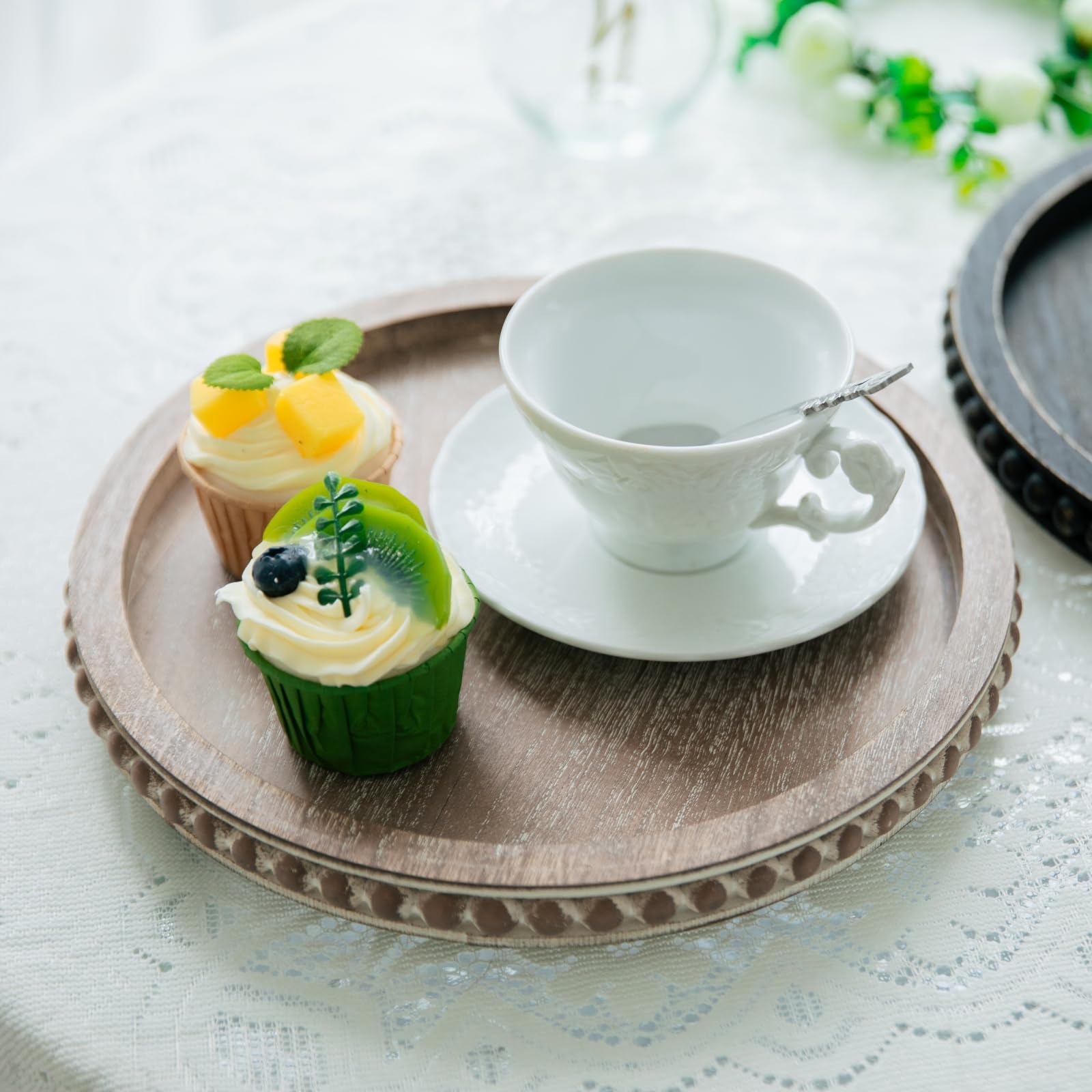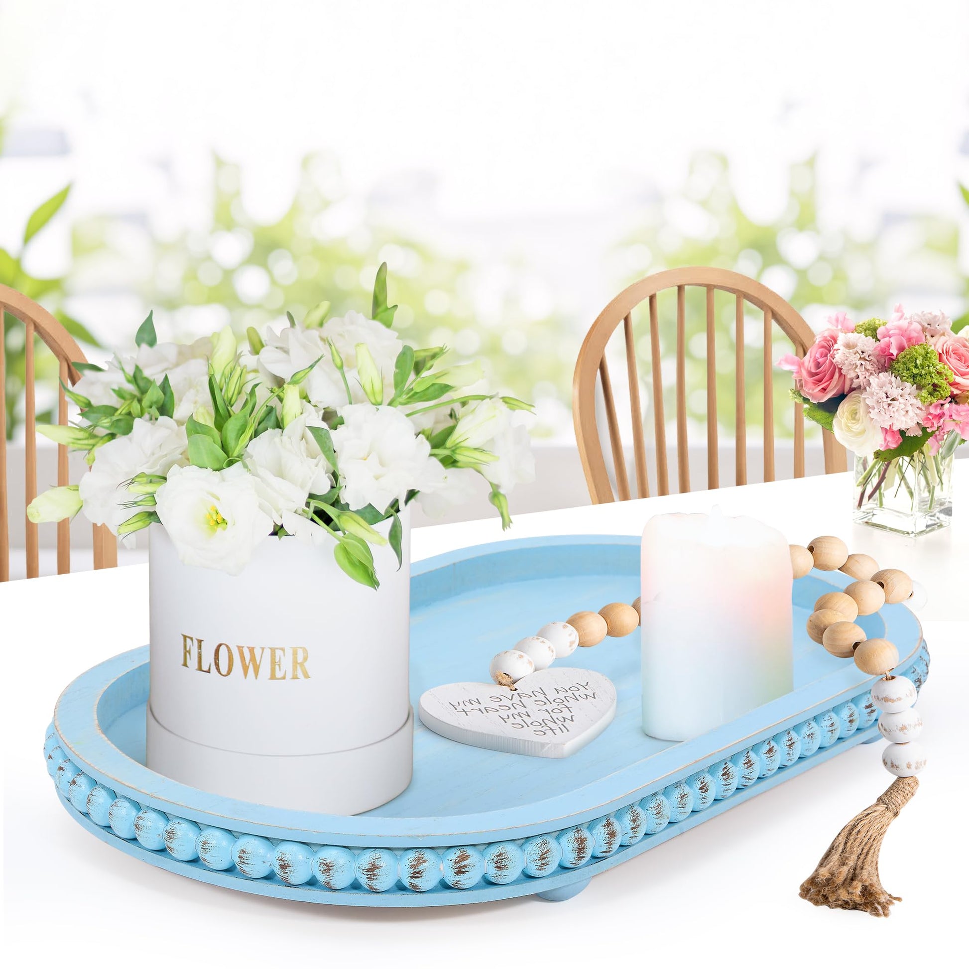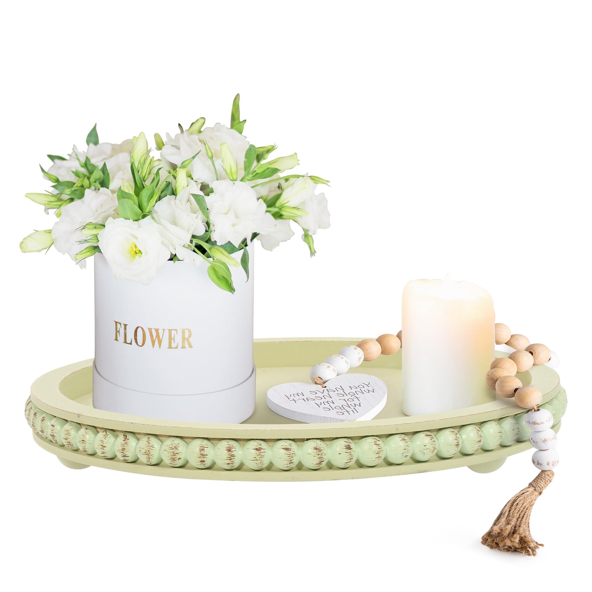 - 【Gorgeous Beaded Tray】:The round beaded tray features special distressed bead accents.Match these items as living room decor, coffee table decor or farmhouse kitchen decor. The decorative tray itself is surely an eye catching and a conversation piece as it comes with unique bead accents around tray.Place it as a centerpiece on your kitchen counter, dining table, entry way table and MORE!