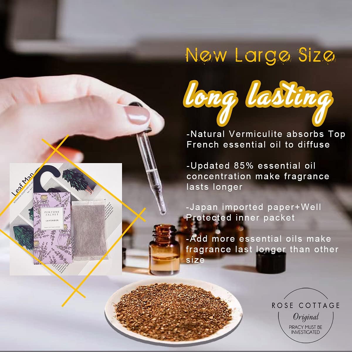 - [Safe Material Made Every Breath Have A Guarantee]Made of top Essential oil created by french professional perfumers.You must haven't smell such unique pure and fresh fragrance .This large size sachets add more essential oils than the small size,making room fresheners dissipates well while lasts longer.You can absolutely trust that they are also great as shoe odor eliminator and trash can deodorizer, keeping your every breath fresh and safe!