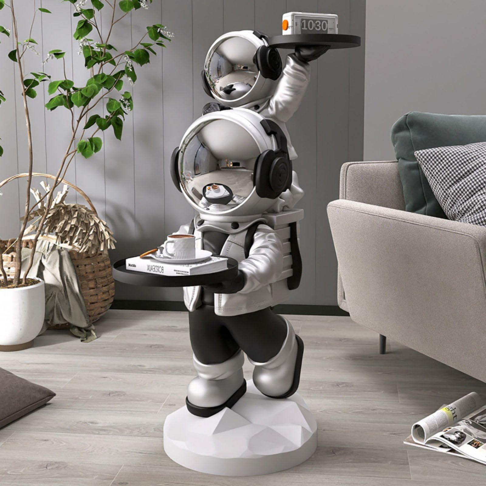 - Versatile Art Ornaments: With 2 trays on top, this astronaut sculpture serves as a functional and versatile accent piece. Use it as a side table in the living room, a bedside table in the bedroom, or even as a decorative statement in your office