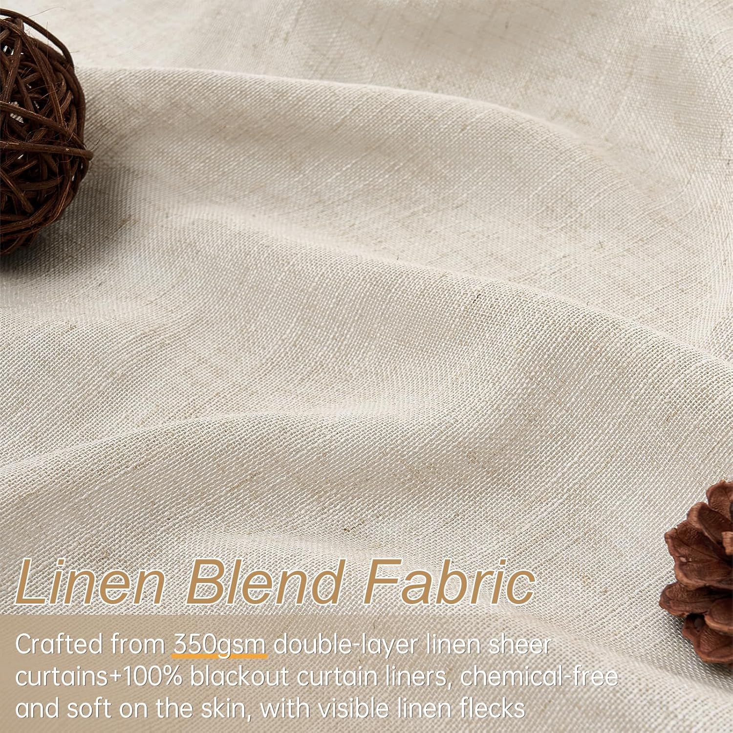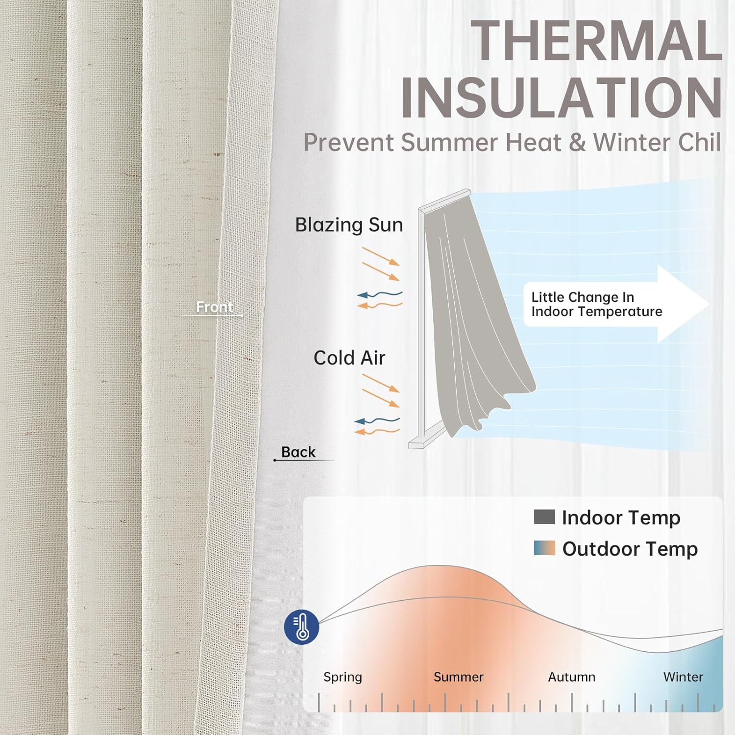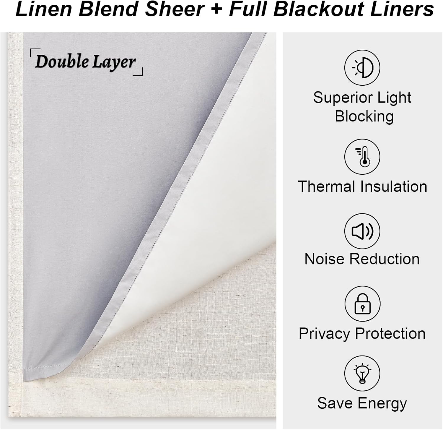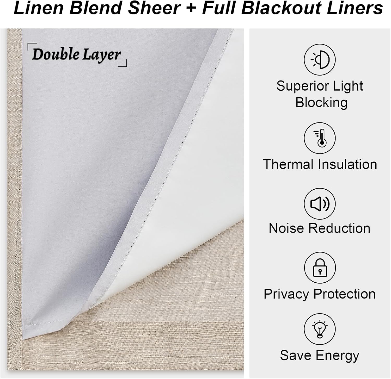 - Selling features:Heavy double layer linen fabric, not only 100% shading, but also both heat and sound insulation,and has very good noise reduction and good privacy,is a good choice for summer and winter