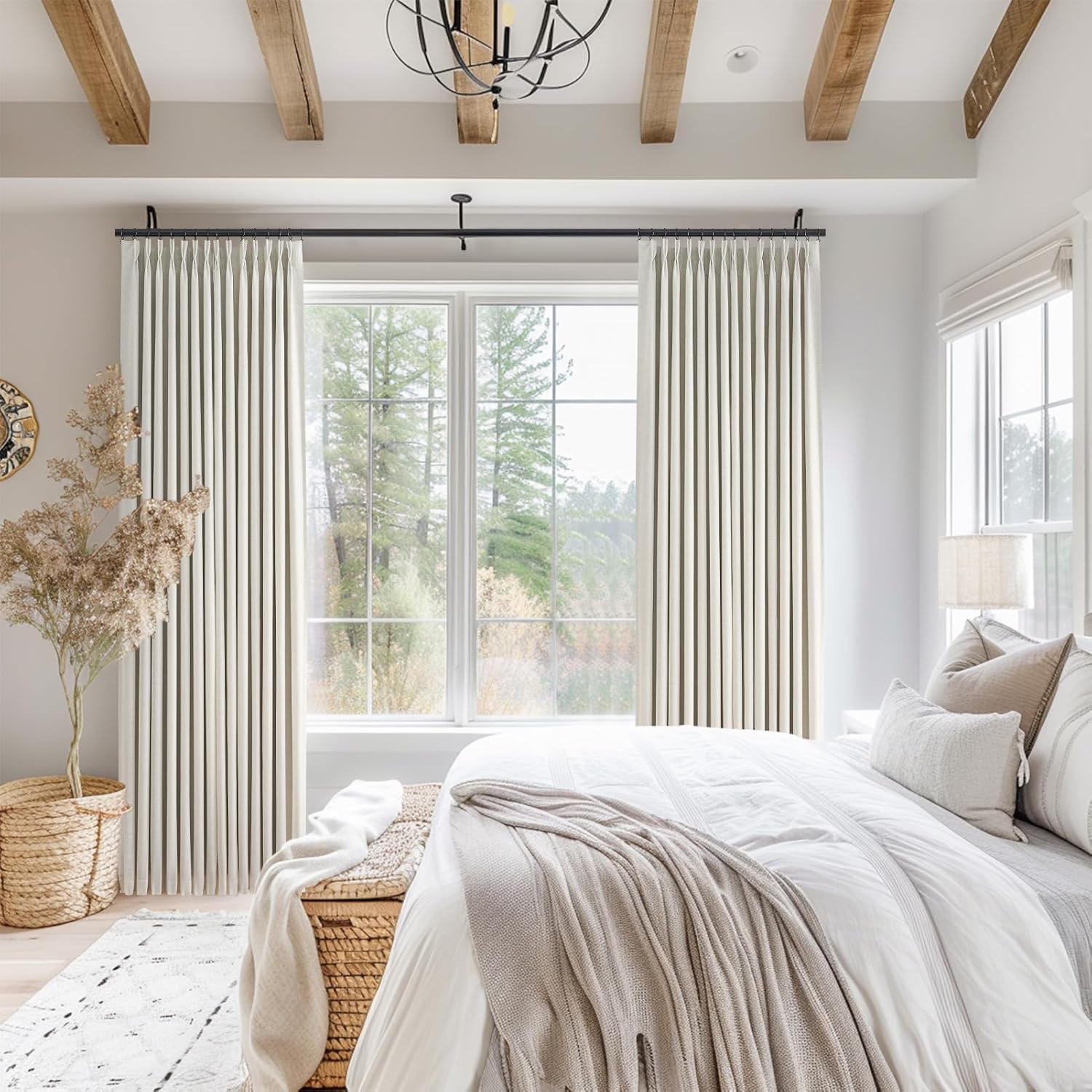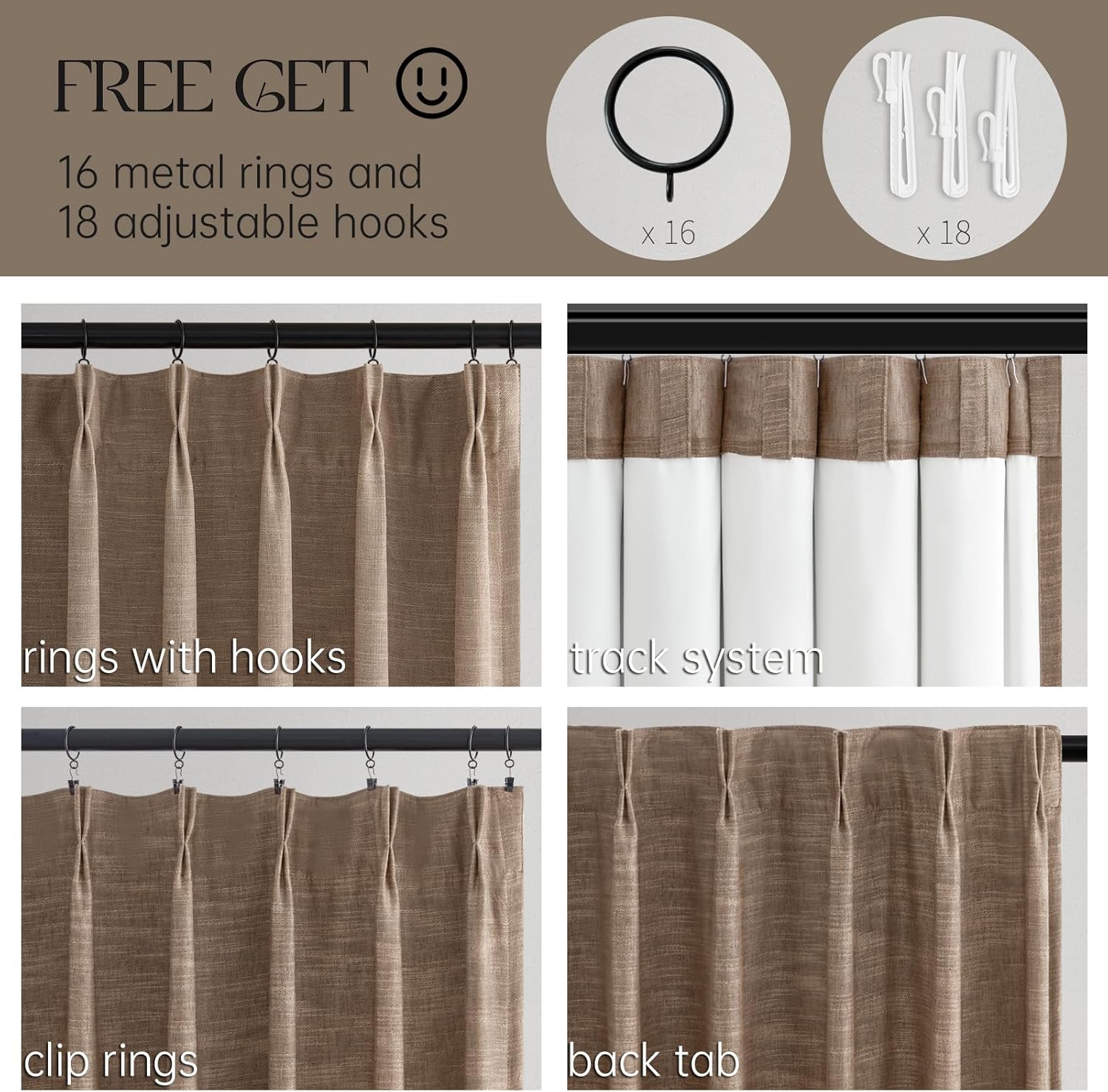 - Pinch Pleated Design: Each panel has 13 pleats,Each package includes 1 panels of pinch pleated curtain with 18 hooks and 16 metal rings, each measuring 72 "Wx108" L with adjustable hooks that raise or lower the height of the curtains by 1 inch,There are 4 hanging options: ring hooks, clip rings,back tabs or track systems,Wide enough for any standard windows from 36w/48w to extra wide 60w/100w large windows