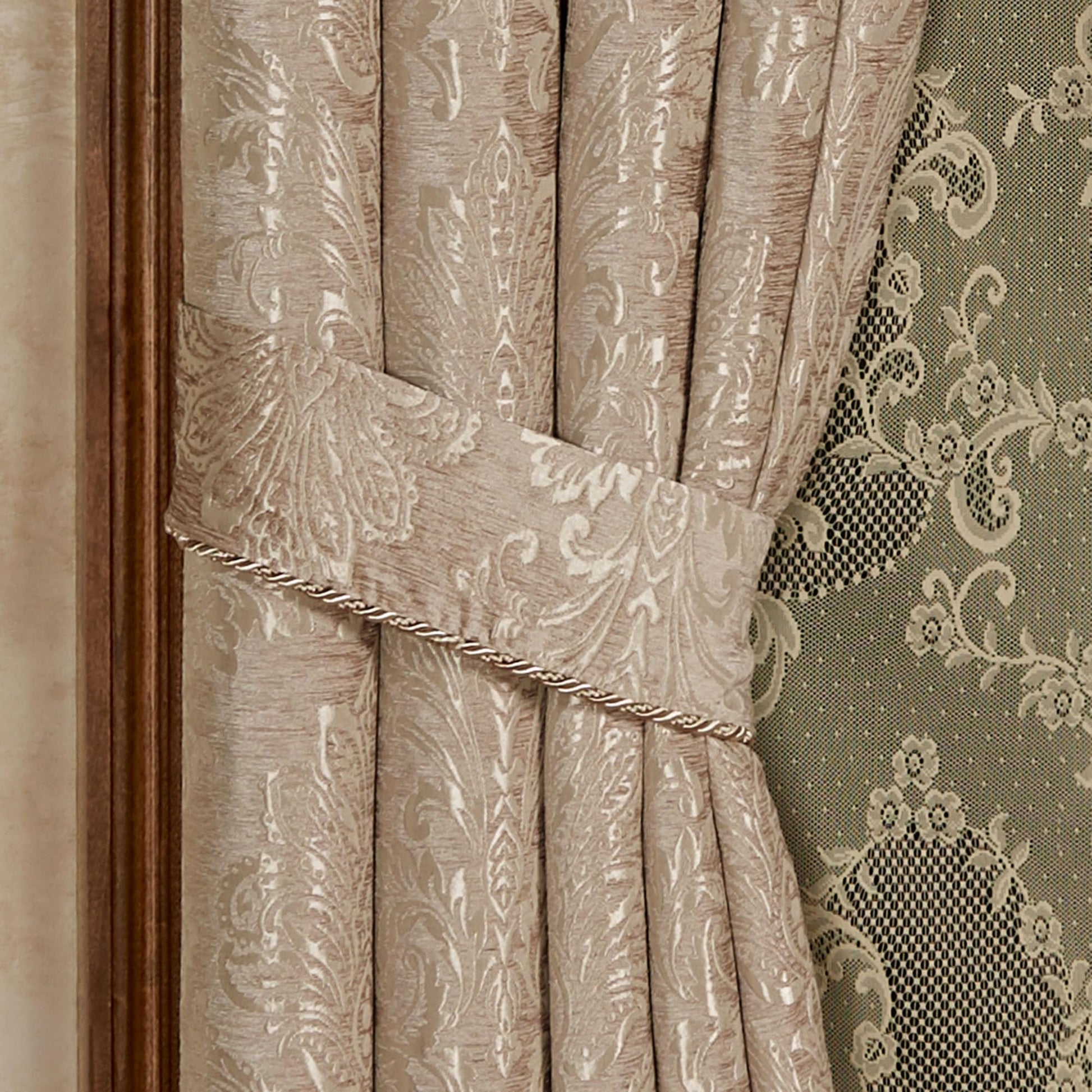 Camelot Window Treatments enhance your space with a regal state of elegance. The lavish jacquard-woven polyester chenille ensemble features luxurious matte satin damask designs in neutral tone-on-tone ivory hues, creating a traditional, luxurious aesthetic. Easily hang each item via the 3" rod pockets and your decorative curtain rod. Window drapery set includes one empire valance and one curtain pair. Wide Empire Valance has gimp trim and 3" brushed fringe on the ends. Transform your space into a sophisticated retreat with these stunning window treatments. Lined Curtains have tailored edges and include tiebacks with twist cording accents. Overall, the Empire Valance measures 110"Wx28"L when flat; this size best fits a 32"W to 42"W window. Curtain Pair measures 84"Wx84"L overall. Machine washable for easy care. Imported.