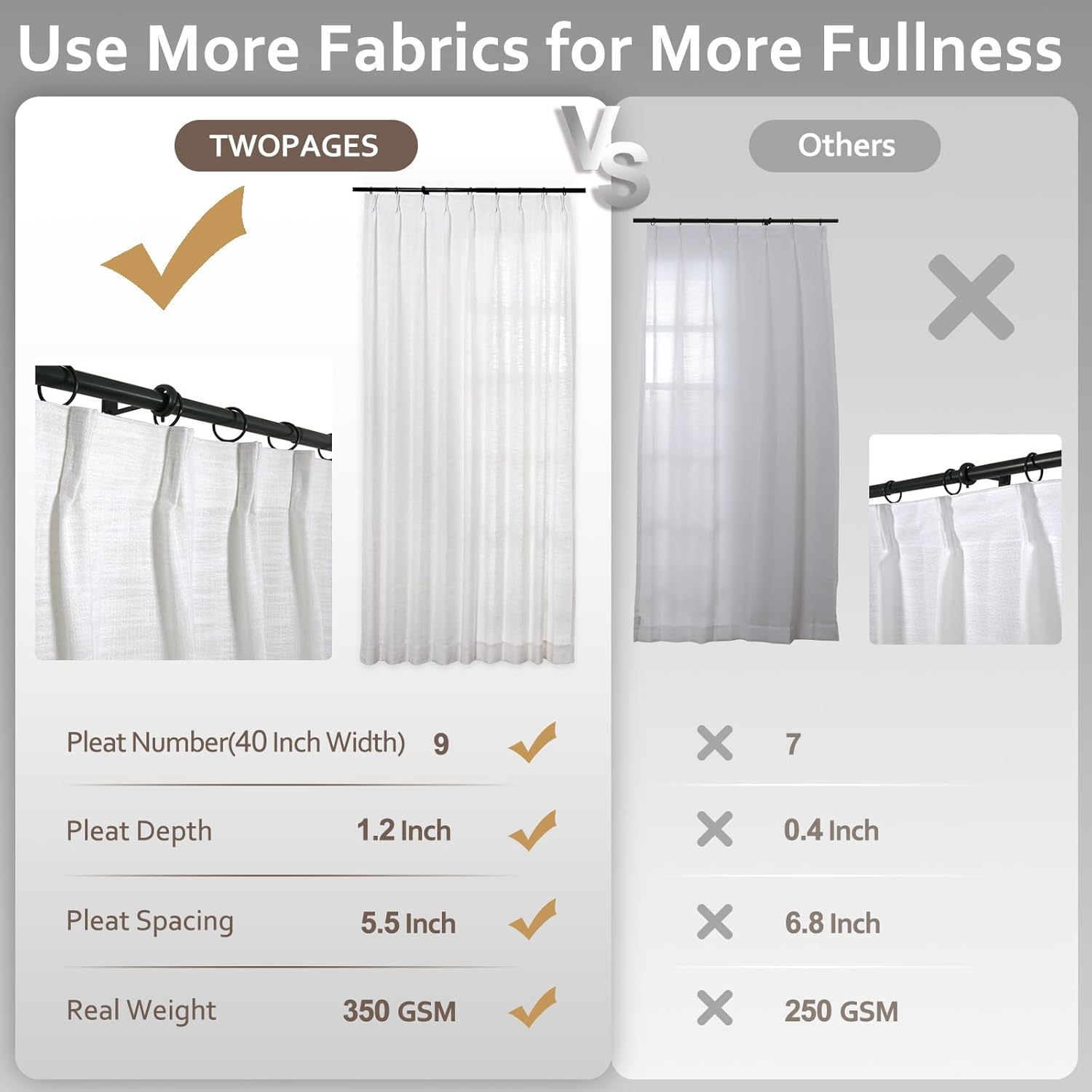 - HEAVYWEIGHT: Sold one 100"W x 102"L panel, weights 17.39 lbs. At least 2X of fabric width are used to make pleats and folds, which are more gathered than other headings and have permanent sewn-in pleats for a more elegant and aesthetic look. Pin hooks which can be adjusted flexibly within 3 inches are included, but the rings are not included.